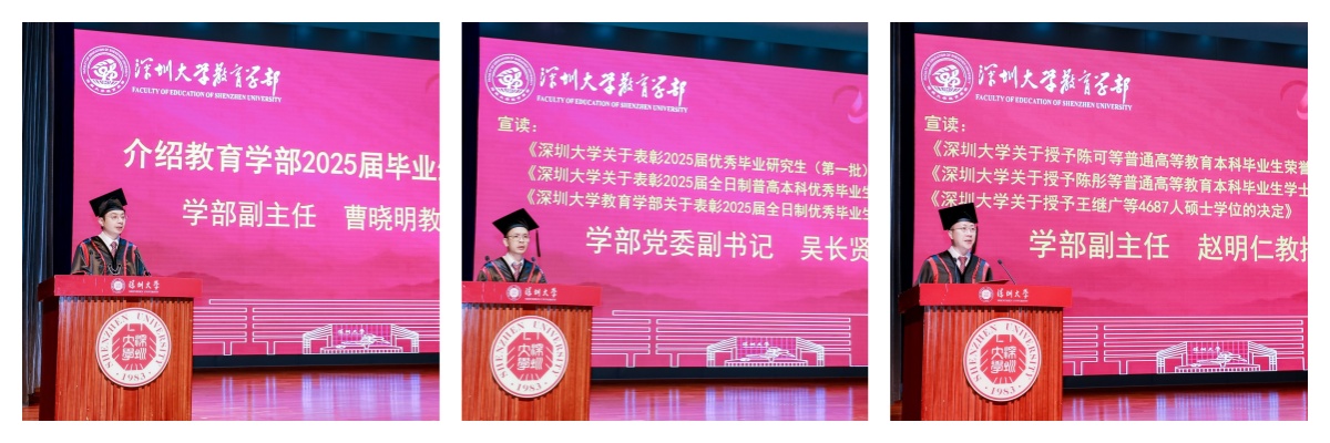 During the ceremony, Cao Xiaoming introduced the 2025 graduates of the Faculty of Education; Wu Changxian announced the decisions by Shenzhen University and the Faculty of Education to commend outstanding full-time graduates of 2025; Zhao Mingren announced the decisions by Shenzhen University to confer bachelor’s and master’s degrees for the Class of 2025.