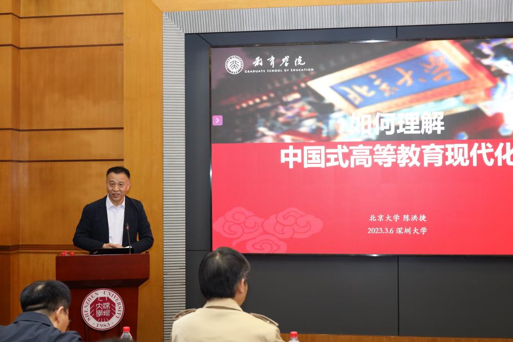 2023年3月6日,深圳大学40周年校庆教育学部知名学者系列讲座活动在国际会议厅D厅举行,北京大学陈洪捷教授为教育学部师生带来题为“如何理解中国高等教育现代化”的专题讲座,现场座无虚席。