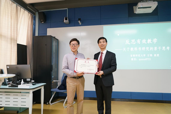 紧接着,石鸥教授围绕“谁来选”、“选什么”和“选得怎么样”三个问题,提出了教科书内容的选择及评价问题。之后他与现场师生进行了热烈的讨论和对话。
