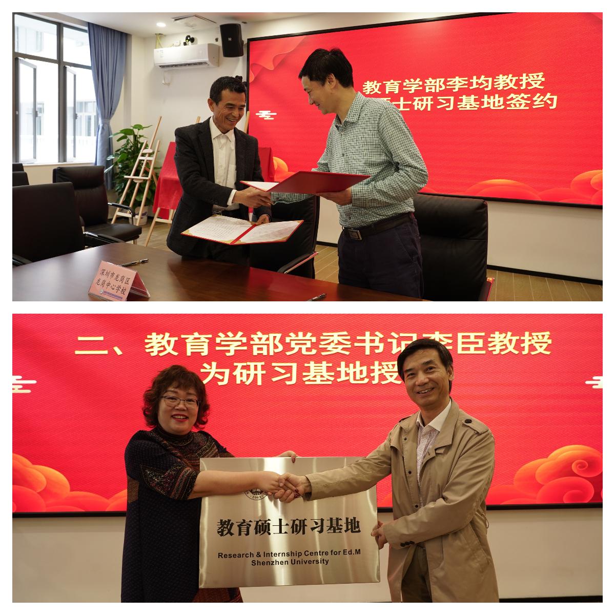 会议伊始,李均代表教育学部分别与福田区皇岗创新实验学校、深圳大学附属教育集团外国语小学、龙岗区龙岗中心学校签署研习基地协议书。李臣依次向三所研习基地学校授牌,并为九位实践指导教师颁发聘书。