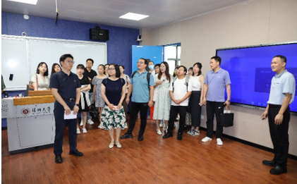 李鹏虎介绍了高教所的情况。他表示,高教所是广东省较早设置的高教研究机构之一,且与厦门大学教育研究院有着深厚的历史渊源。建所37年以来,培养了超过100名的研究生,有10多名学生考取厦门大学、华中科技大学、华东师范大学等国内外名校博士研究生。近年来,高教所作为主要力量参与了《深圳大学章程》《深圳大学发展战略研究报告》《深圳大学教学改革方案》《深圳大学师范教育行动方案》等重要规划和方案的研制。 覃红霞感谢高教所的盛情接待,随即介绍了厦门大学教育研究院博士生调研团的历史及来访调研目的等,并希望能够与高教所开展进一步的交流与合作。随后,双方师生围绕学科建设、人才培养、科学研究等话题展开深入交流。 接着,在李鹏虎、王璧、孟繁雁等老师的陪同下,调研团参观了教育学部教师教育实验教学中心、学部虚拟仿真实验室、混合现实实验与人工智能实验室。教师教育实验教学中心主任骆平,教育技术系程国雄、康隽瑞等老师进行了详细介绍。