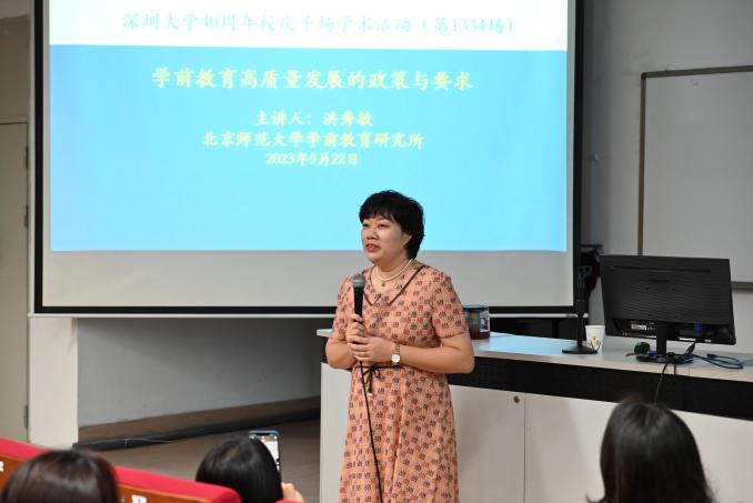 2023年9月22日下午,深圳大学40周年校庆暨教育学部知名学者系列讲座活动在教育学部A栋教学楼204会议室举行,北京师范大学洪秀敏教授受邀莅临我校,并带来题为《学前教育高质量发展的政策与要求》的学术讲座。讲座由教育学部党委书记李臣教授致欢迎辞,学前教育系主任刘国艳副教授主持和教育学部相关师生参与。
