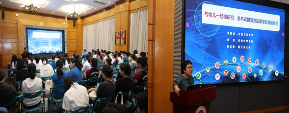 2023年11月9日晚,北京师范大学李敏谊教授应邀在国际会议厅D厅开设了主题为《与幼儿一起做研究—参与式视觉方法论与儿童的视角》讲座。学前教育系谢莎老师主持讲座,数十位学部师生认真聆听并进行交流。 李敏谊教授从儿童观、方法论和社会发展观的三个角度,围绕“为什么需要与幼儿一起做研究”、“儿童的视角+参与式研究+视觉方法论是什么”等问题,探讨了学前教育科学研究方法从 “针对儿童的研究”到 “与儿童一起研究”的转变。她强调了儿童的声音要被听见,也要有听众,幼小的儿童也是有决策权等科学的教育观与儿童观。 让师生进一步认识到在儿童研究中实地反思日记方法的重要意义。