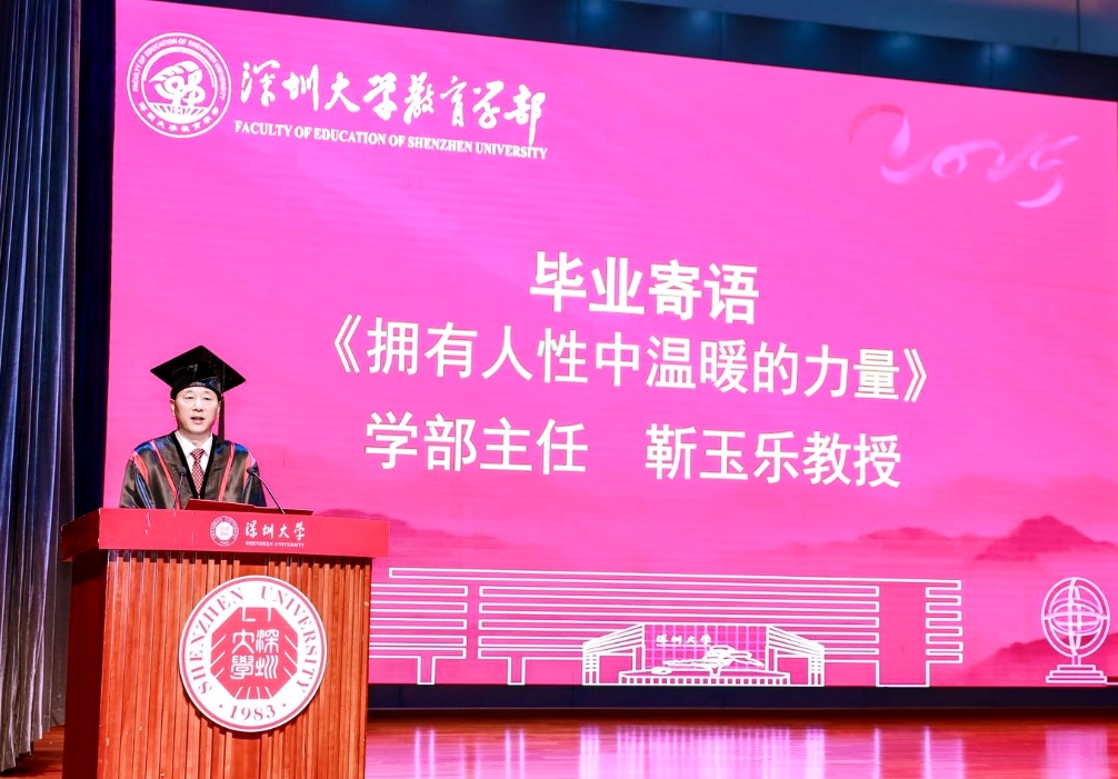 最后,靳玉乐以《拥有人性中温暖的力量》为题给2025届毕业生送上深情寄语。他向即将扬帆远航的毕业学子们提出了四点希望:一要心怀爱意。爱是一种积极向上的情感,更是助人成长的关键能力。尤其对投身教育事业的人来说,爱是教育的灵魂所在;二要培养欣赏的眼光。欣赏体现着积极的心态,能够汇聚正能量。在教育过程中,欣赏可以点亮学生的心灵;三要坚守善良本性。善良是真诚的情感流露,更是崇高的精神境界,教育应成为传递善良的载体;四要学会包容。包容是中华传统美德,彰显着中国人的智慧,也是教育不可或缺的强大力量。他鼓励大家向着爱、欣赏、善良与包容的人生高度努力,并借助这些温暖的人性力量,铸就美好的人生篇章。