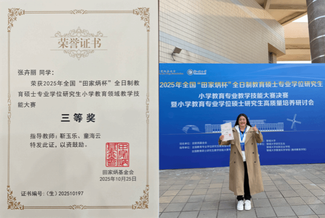 10 月 24 日至 26 日,2025 年全国 “田家炳杯” 全日制教育硕士专业学位研究生小学教育领域教学技能大赛决赛在山东省聊城大学圆满落幕。经过多轮激烈比拼,深圳大学教育学部 2023 级小学教育专业硕士研究生张卉丽凭借出色的教学设计、娴熟的课堂把控与扎实的专业素养,在小学科学赛道脱颖而出,荣获全国三等奖,为学校赢得荣誉,也标志着我校小学教育专业硕士培养质量再获全国认可。