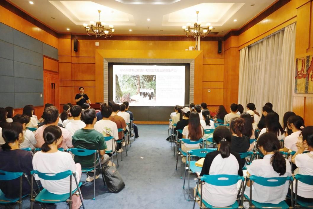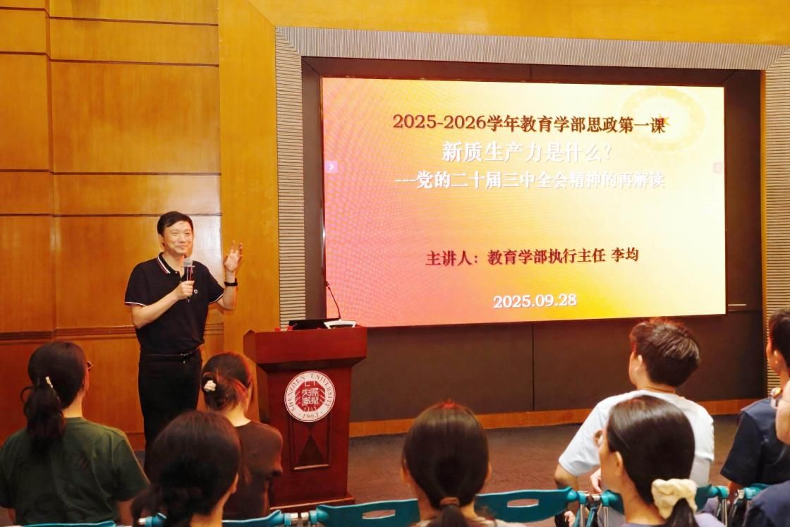 为深入贯彻党的二十届三中全会精神,引导学生深刻领会党中央关于新时代新征程推进中国式现代化的重大意义,厚植理想信念根基,切实增强学习贯彻全会精神的政治自觉和行动自觉。9月28日,教育学部执行主任李均教授以“新质生产力是什么?---党的二十届三中全会精神的再解读”为主题,在国际会议厅为同学们讲授思政第一课,100余名学员及师生党员参会。