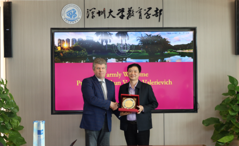 紧接着,瓦季姆·格林什昆教授对深圳大学教育学部的热情接待表示衷心感谢,并简要介绍了随行成员。瓦季姆·格林什昆教授指出,俄罗斯人民友谊大学建校60余年,是俄罗斯的一所极具声望的综合性大学,近年来也有越来越多的中国留学生前来学习。随后,瓦季姆·格林什昆教授就深圳大学重点学科建设、通识教育课程、教师教育体制、博士点建设、教育研究机构建设等问题进行提问,李均教授一一为其解答。